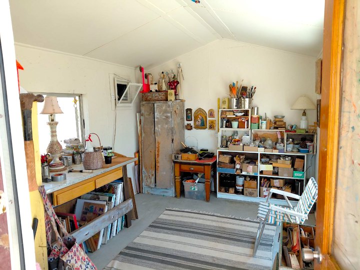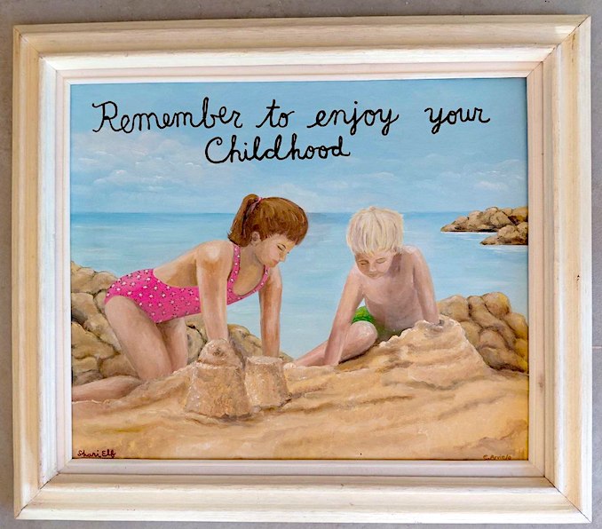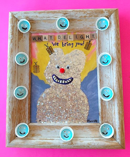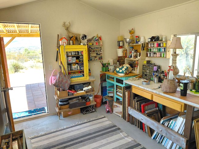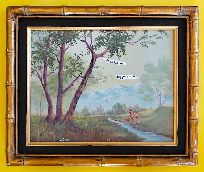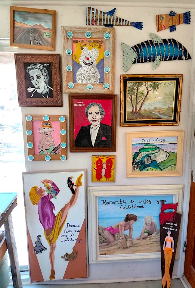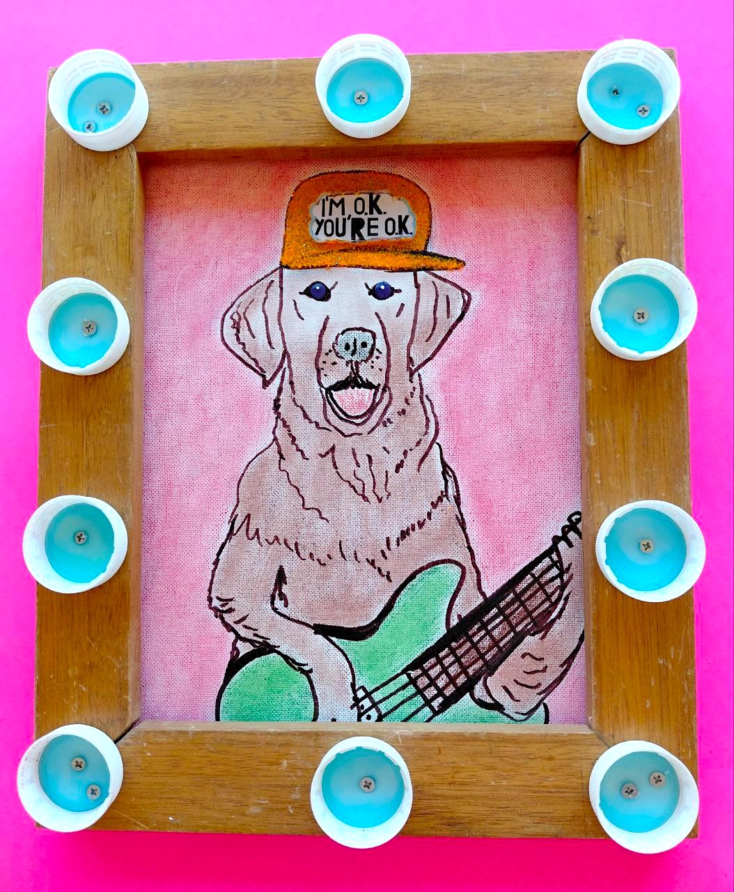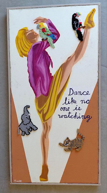 Dance like no one is watching 19" x 37" $100 plus postage or you can pick up in Joshua Tree. made last week from a thrift store painting, I covered holes with vintage yarn cross stitch animals found on ebay