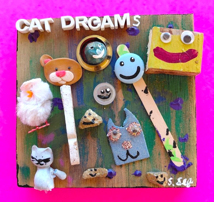 CAT DREAMS 5.5" x 6" $40 one of the first new works made in my new art studio homestead cabin, playing the art game with my wonderful neighbor Josh Landon (who gave me the cabin!) and Teri and our neighbor Gina who moved to Nova Scotia) |