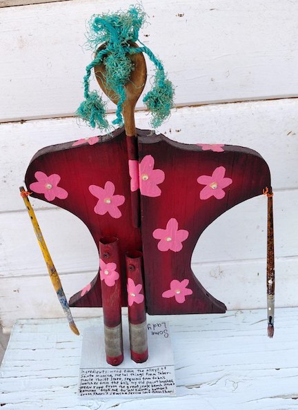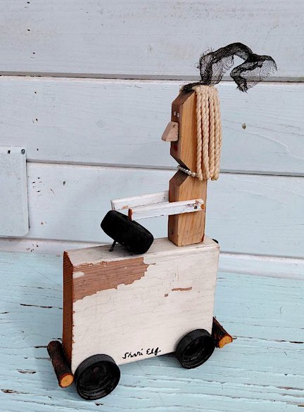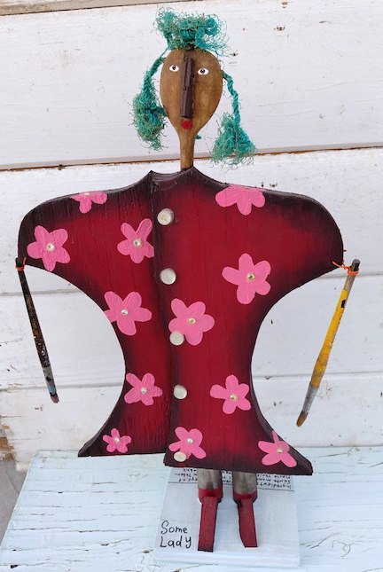 YARD LADY 5 feet tall, base yellow wooden box is 10" x 10" $400 made in 2000
