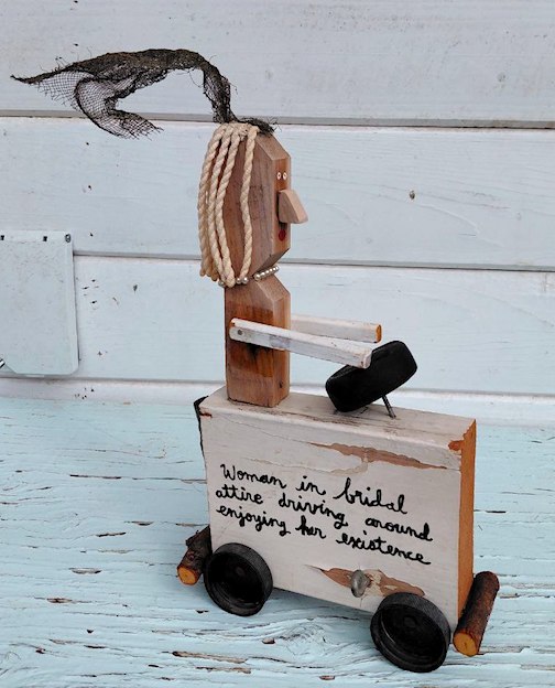 WOMAN IN BRIDAL ATTIRE DRIVING AROUND ENJOYING HER EXISTENCE 12.5" height x 7.5" $200 made in 1998